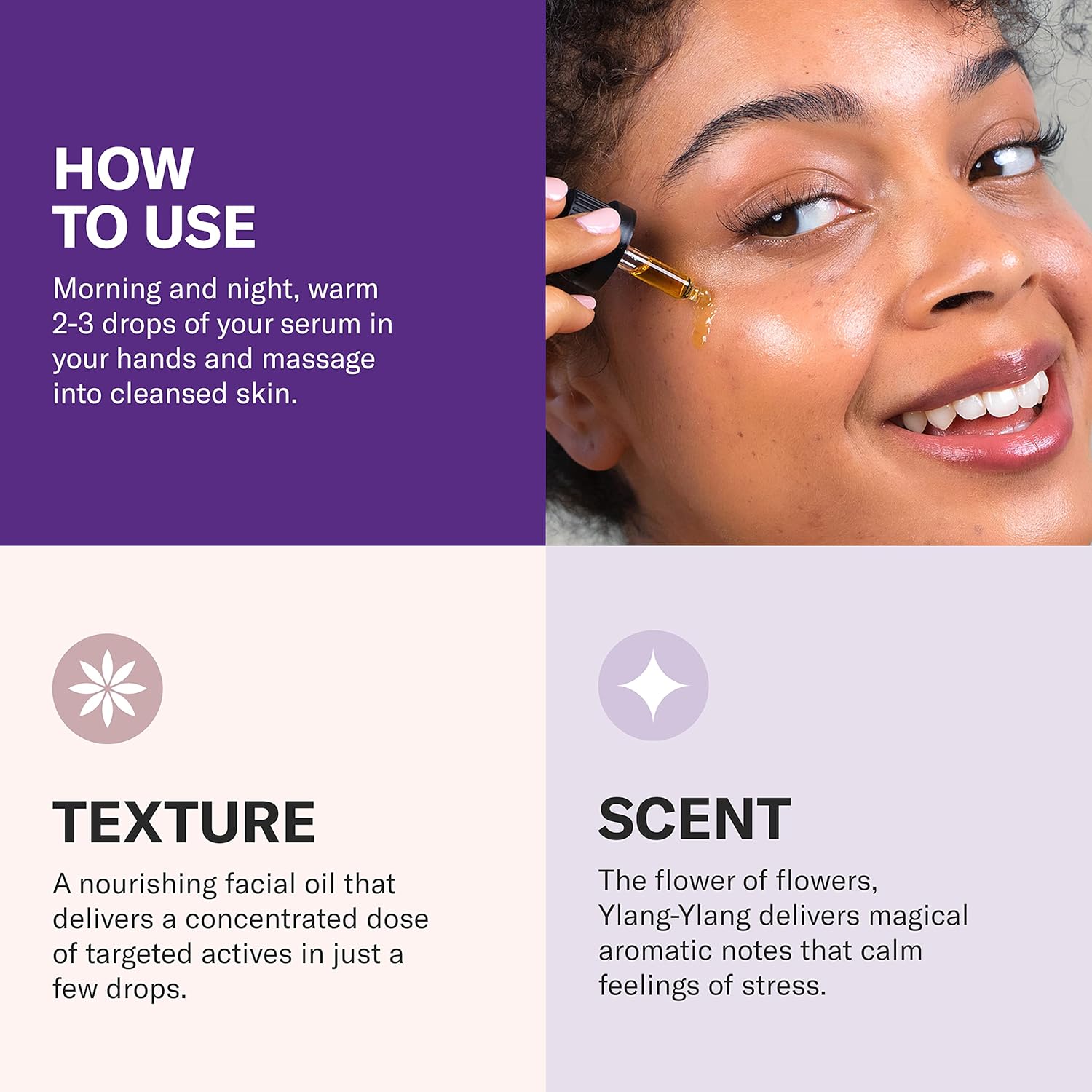 • Ingredient Power: One of the most revitalizing oils, our Rosehip Oil is full of vitamins, antioxidants, and essential fatty acids to visibly reduce signs of aging. Our Ylang-Ylang Oil pairs synergistically with Rosehip to enhance antioxidant activity, helping improve the appearance of aging skin.