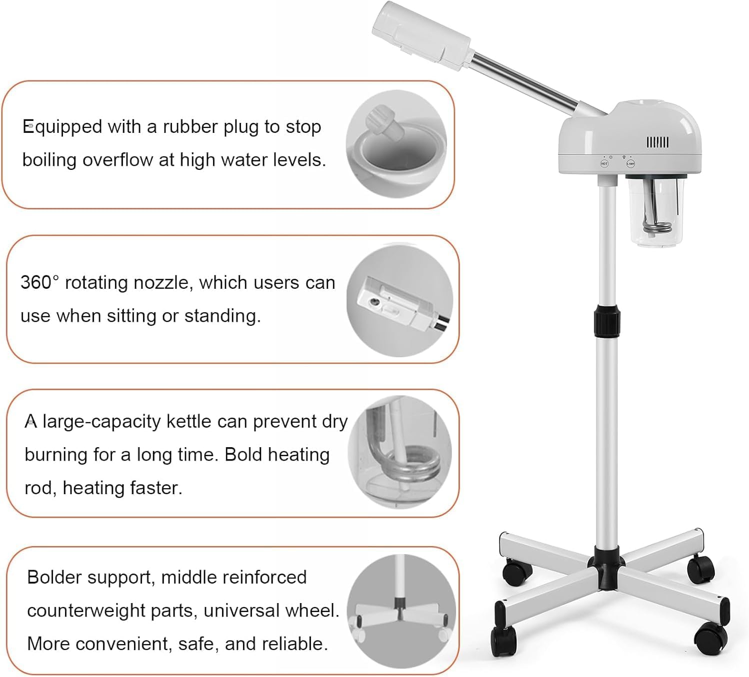 - Adjustable Height & 360° Rotatable Nozzle: The adjustable height(38"-47.83") and 360° rotating nozzle allows you to complete your facial spa at multiple angles and heights conveniently. Place the sponge in the aromatherapy cartridge at the nozzle, drop in the aromatherapy oil and enjoy your aromatherapy spa.