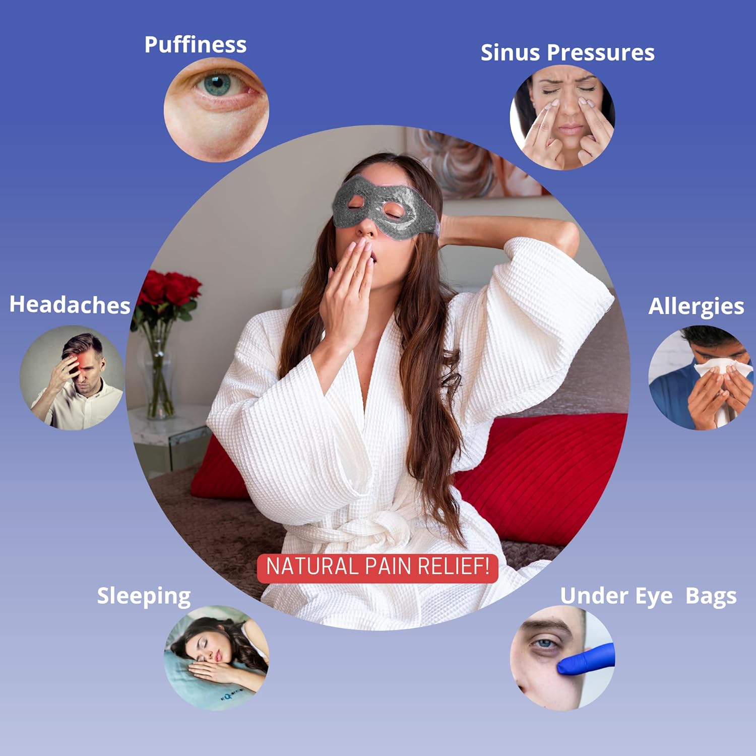 - SOOTHING TREATMENT FOR MANY ACHES AND PAINS - Use the Velcro-like strap to secure it, and in as few as 5 minutes youโll feel relief. The eye pad helps Swelling, Puffiness, Dryness, Dark Circles, Under Eye Bags, Headaches, TMJ, Allergies, Sinus Issues, Bruxism, Acne, Blackheads, Sleeping, and Aging Skin.