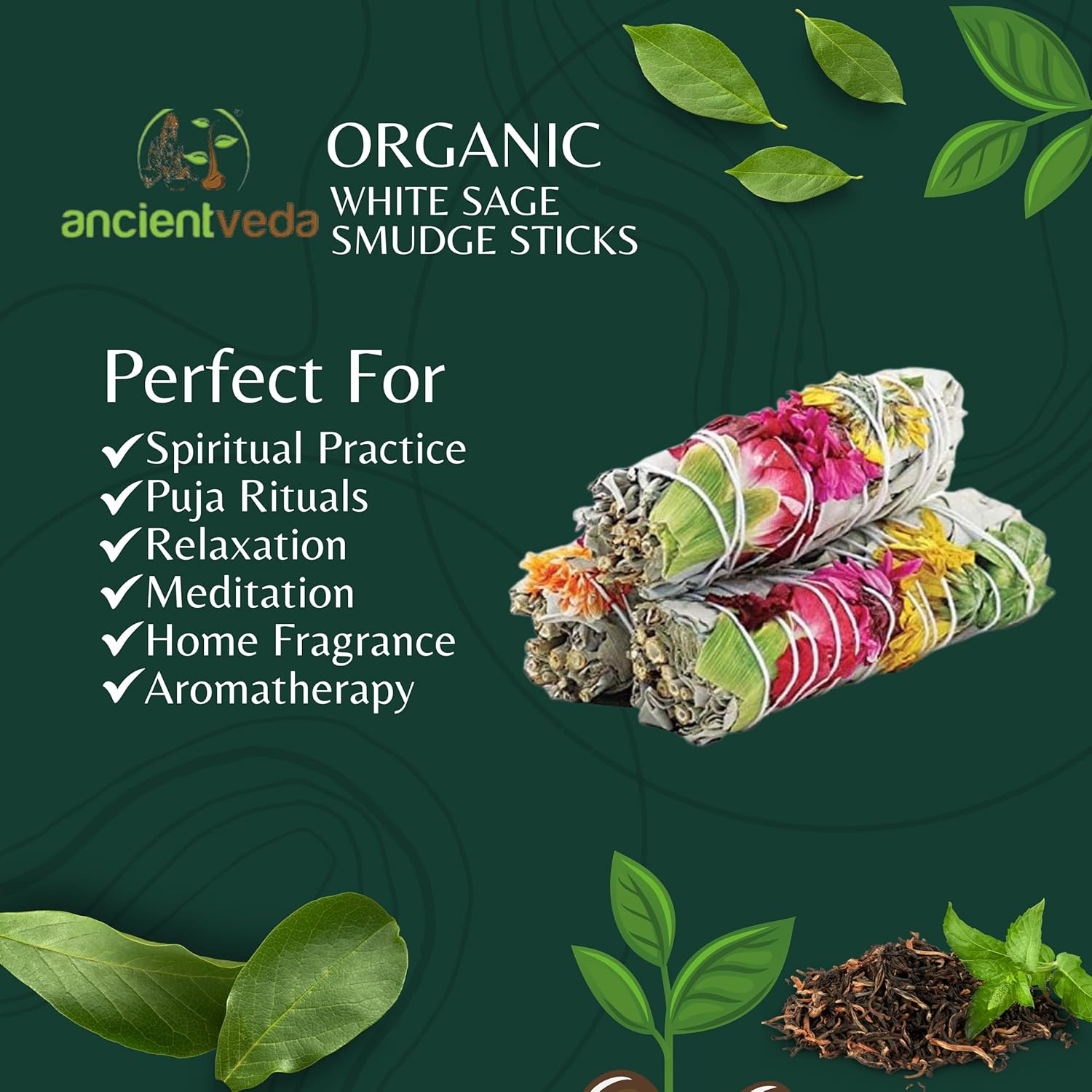 Ancient Veda Joy Organic White Sage Smudge Sticks with Flowers for Cleansing Home, Meditation, Yoga, Healing and Smudging | Sustainably Sourced California White Sage Bundles (3 Pack - 4 Inch)