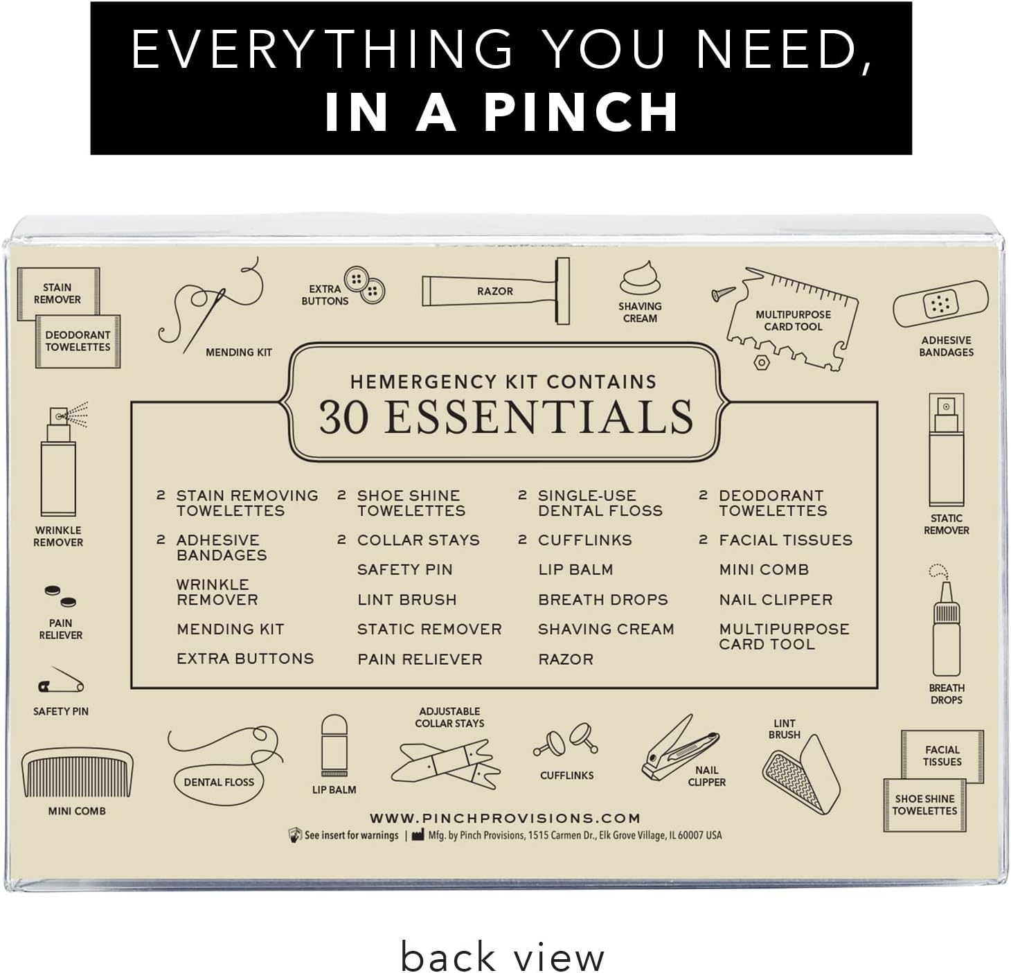 - PERSONAL GROOMING & EMERGENCY KIT FOR MEN - Men have emergencies too, and to tackle those, Pinch Provisions' Hemergency Kit is the perfect choice. It includes necessary, practical items that save the day so that you look and feel your best!