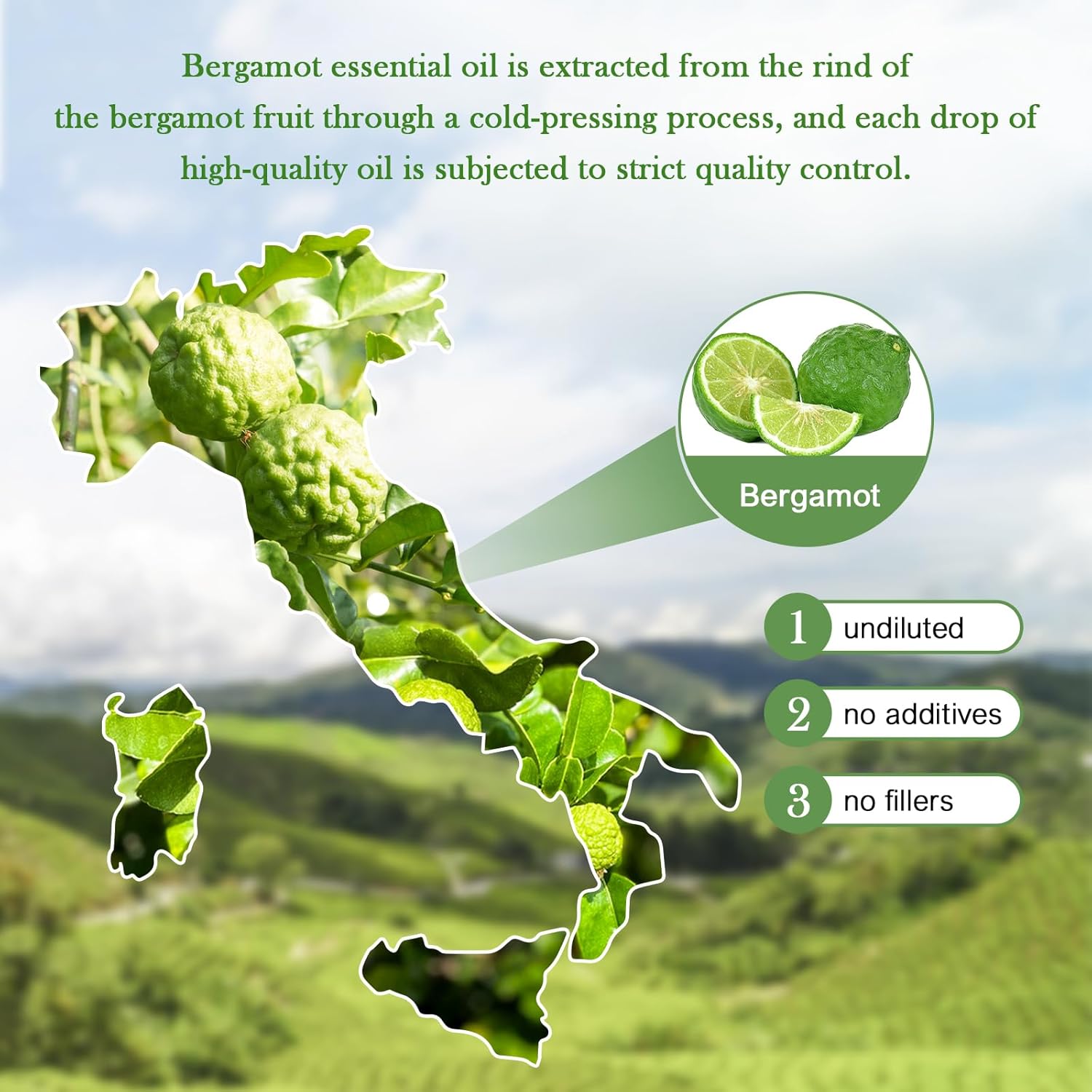 - Bergamot Essential Oil: Citrus bergamia, clean, fresh, calm, relax. 100% pure bergamot oil, extracted from fresh citrus peel by cold pressing, undiluted, no additives, no fillers