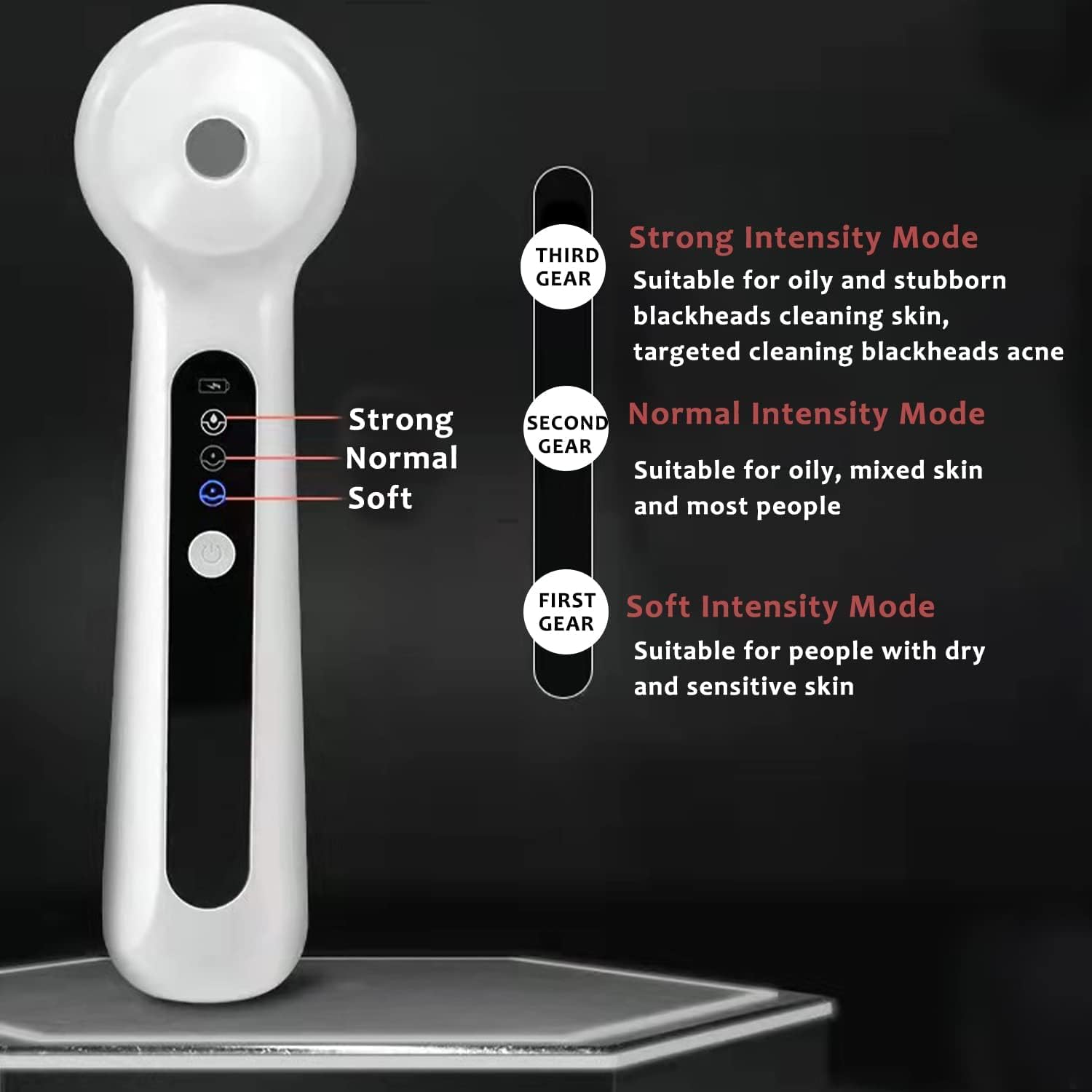 - Skin Type Customization: Equipped with 3 distinct cleaning modes - strong, medium, and soft - this vacuum cleaner suction tool is designed to cater to all skin types. Simply choose the mode that best suits your skin.