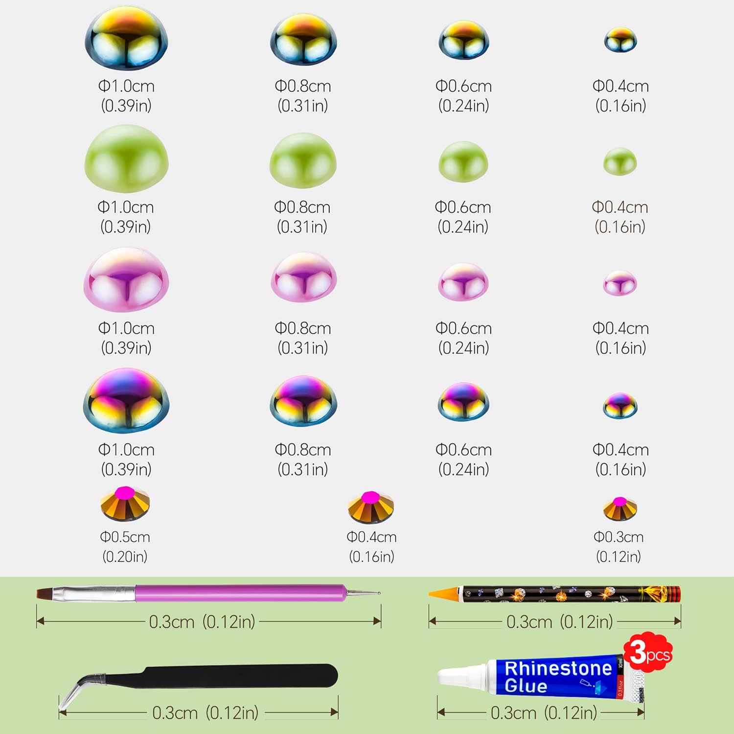 - Assortment Sizes: The flatback half pearls come in a mixture of colors and sizes of 3/4/5/6/8/10mm. The flatback rhinestones are resin rhinestones in sizes of 2/3/4/5/6mm. These mixes are such a great way to get an assortment of colors and sizes without having to buy each item individually