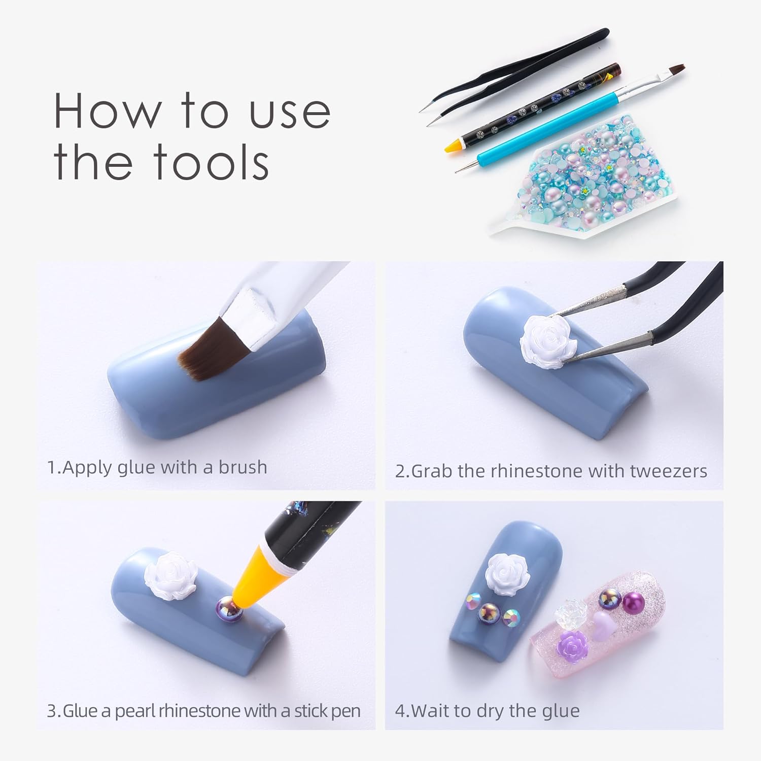 - Useful tools - These pearls and rhinestones have a flat back, which is excellent for easy placement.and you can pick up any large or small pearls and rhinestones with the crayons we bring along. And use the brush to smooth out the Gel, these tools will work very well