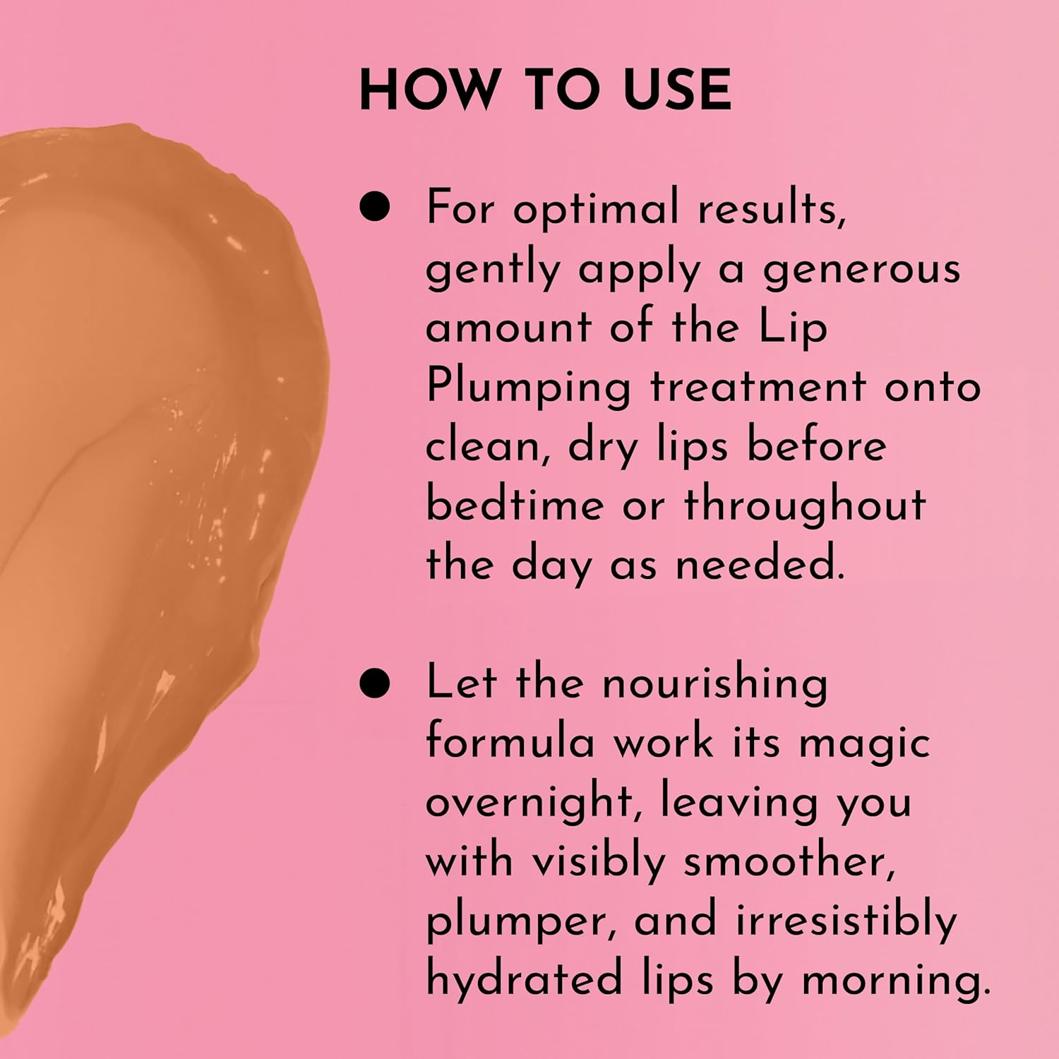 - How to Use: Apply generously onto clean, dry lips before bed or throughout the day as needed for optimal hydration and plumping effects. Let the mask work its magic overnight, and wake up to fuller-looking, smoother, and more hydrated lips.