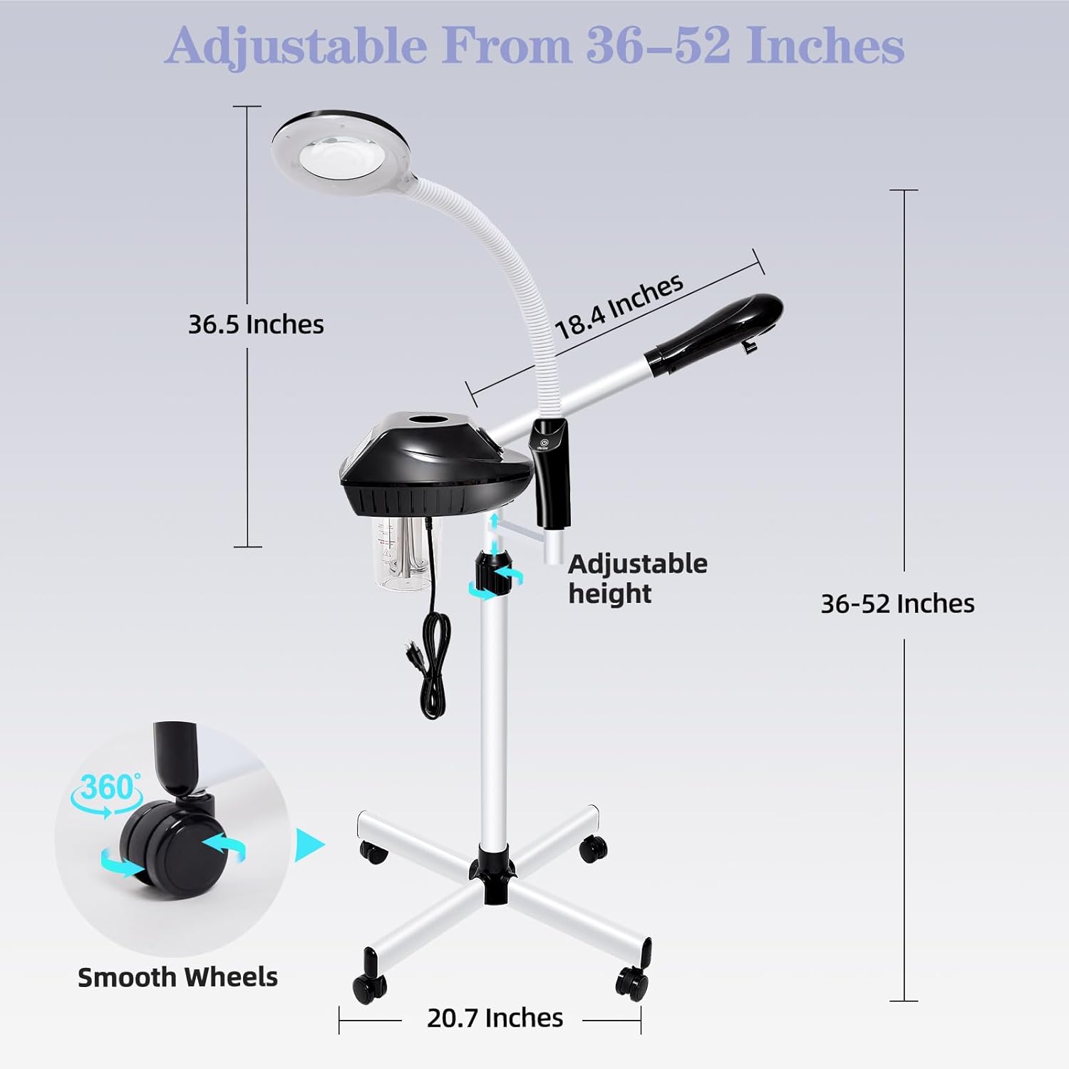 - 【Facial Steamer Professional】The facial steamer comes with an upgraded atomizing cartridge, removable 500 ML water cup, 36-52 inch adjustable height, 360° rotating nozzle, and 360° rotating body.