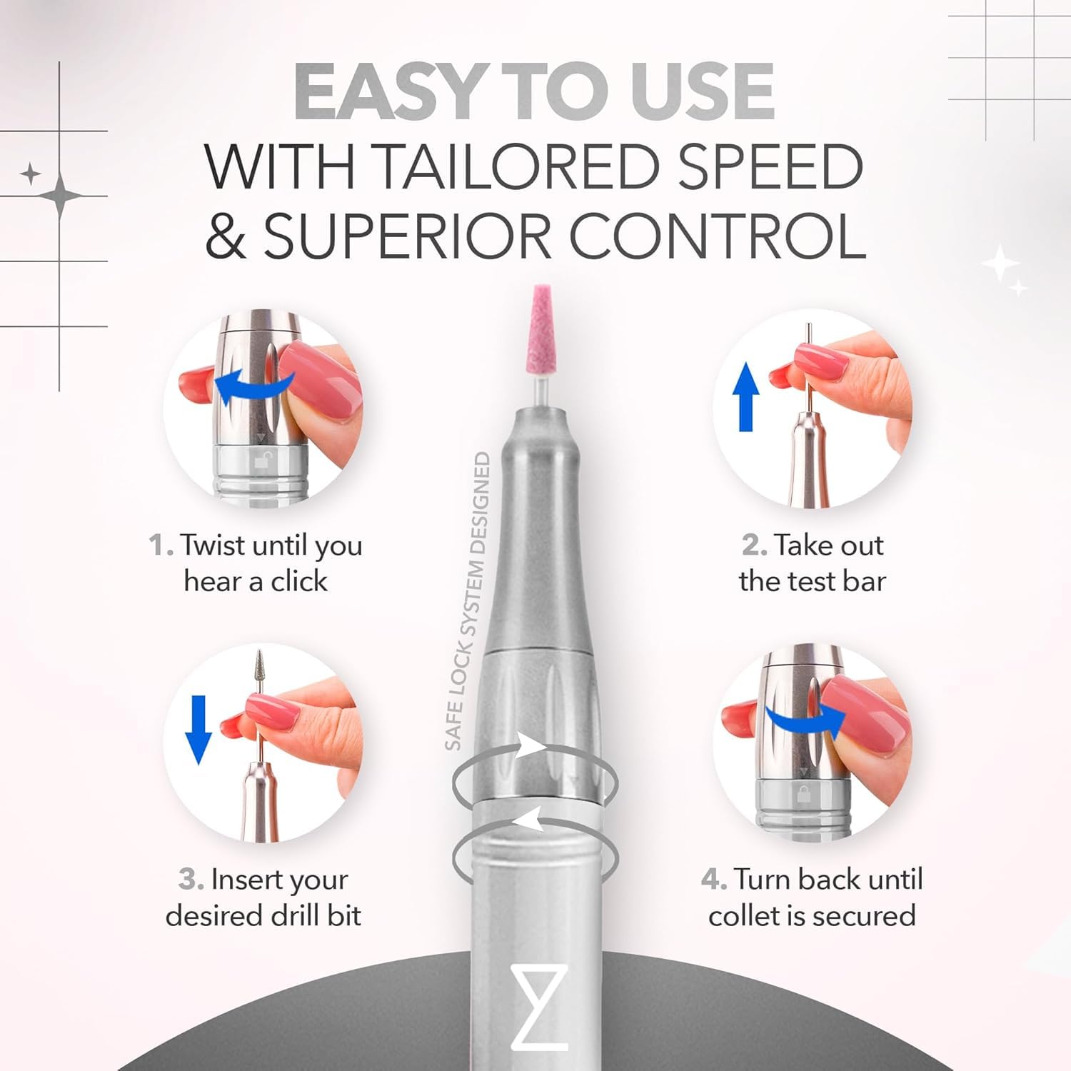 - DESIGNED FOR SALON QUALITY NAILS: The M cordless nail drill is a must-have for professionals and beginners to obtain flawless nails quickly and easily. Master the art of flawless nails with this powerful, adjustable, and user-friendly efile nail drill