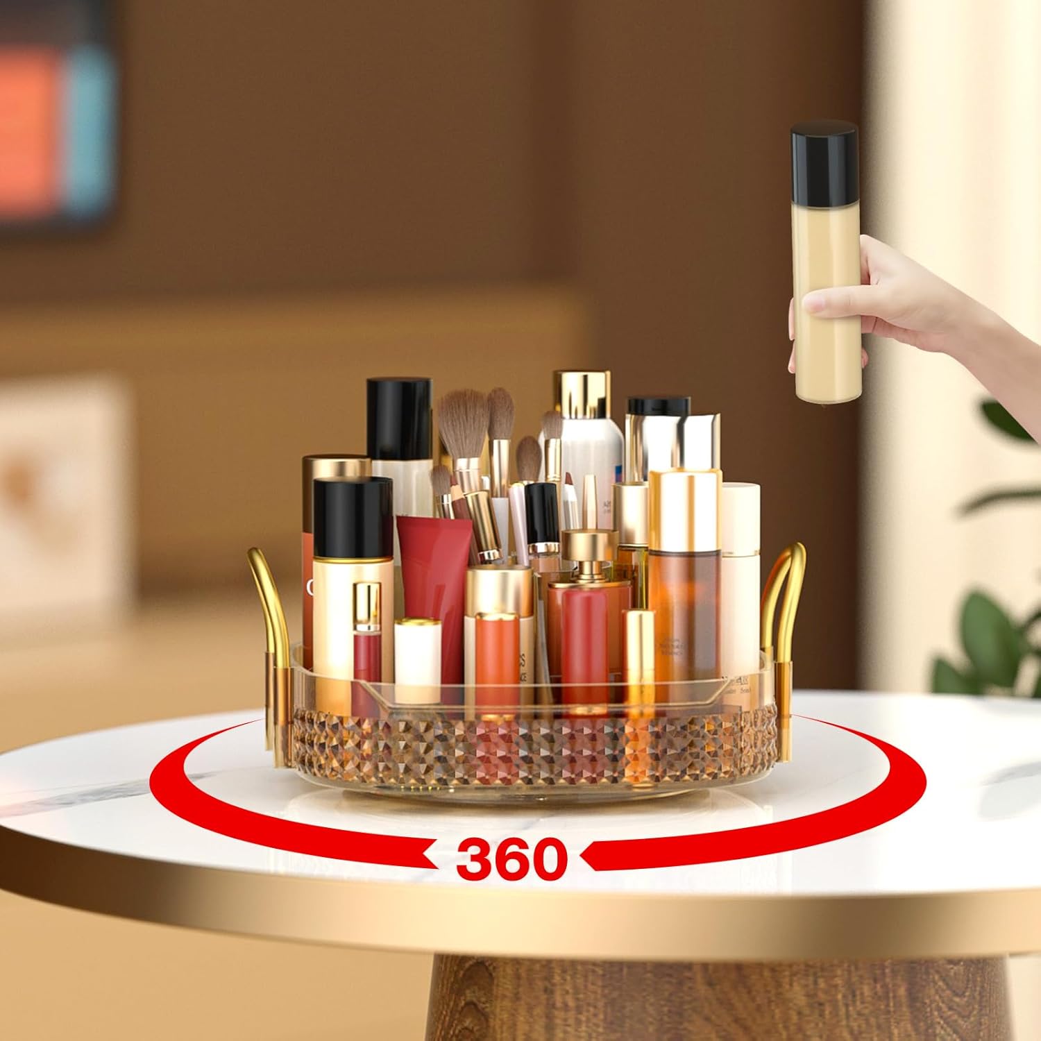 - 360 Degree Rotation& Easy to Install:➤Reinforced steady base rotates smoothly and silently, the rotating makeup organizer is easy access to all of your make-up in seconds.Less installation step are required other than inserting metal rack and handle,do not worry about repeated disassembly to shorten the lifetime of the makeup organizer.