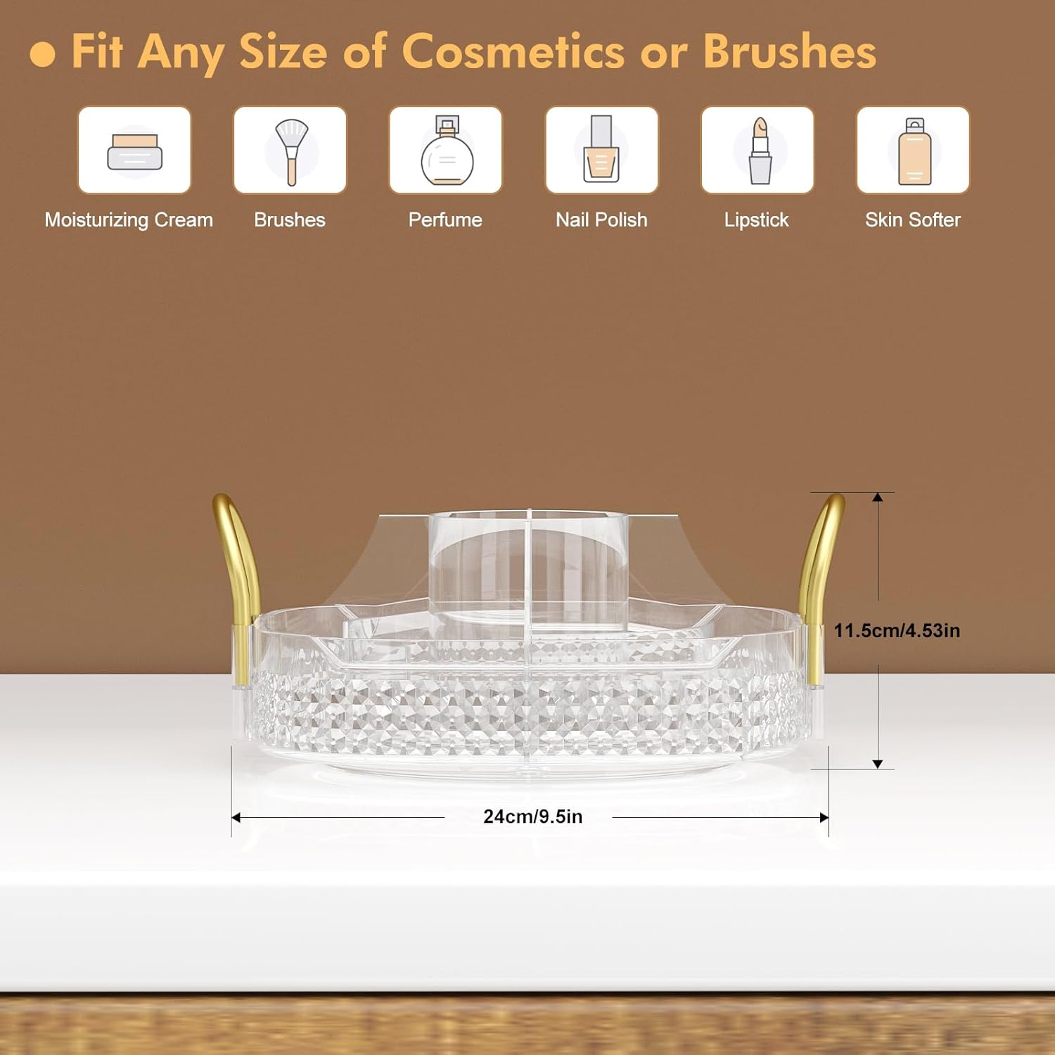 - Washable and Metal Stand:➤Awenia cosmetic organizer with clear acrylic material can be washed or wiped with a damp cloth,cleaned as good as new.Gold stainless steel stand and unique diamond pattern make the perfume organizer more strong,firm beautiful and easy to move. The 360 makeup organizer can be place in Dresser,Bathroom and Kitchen.