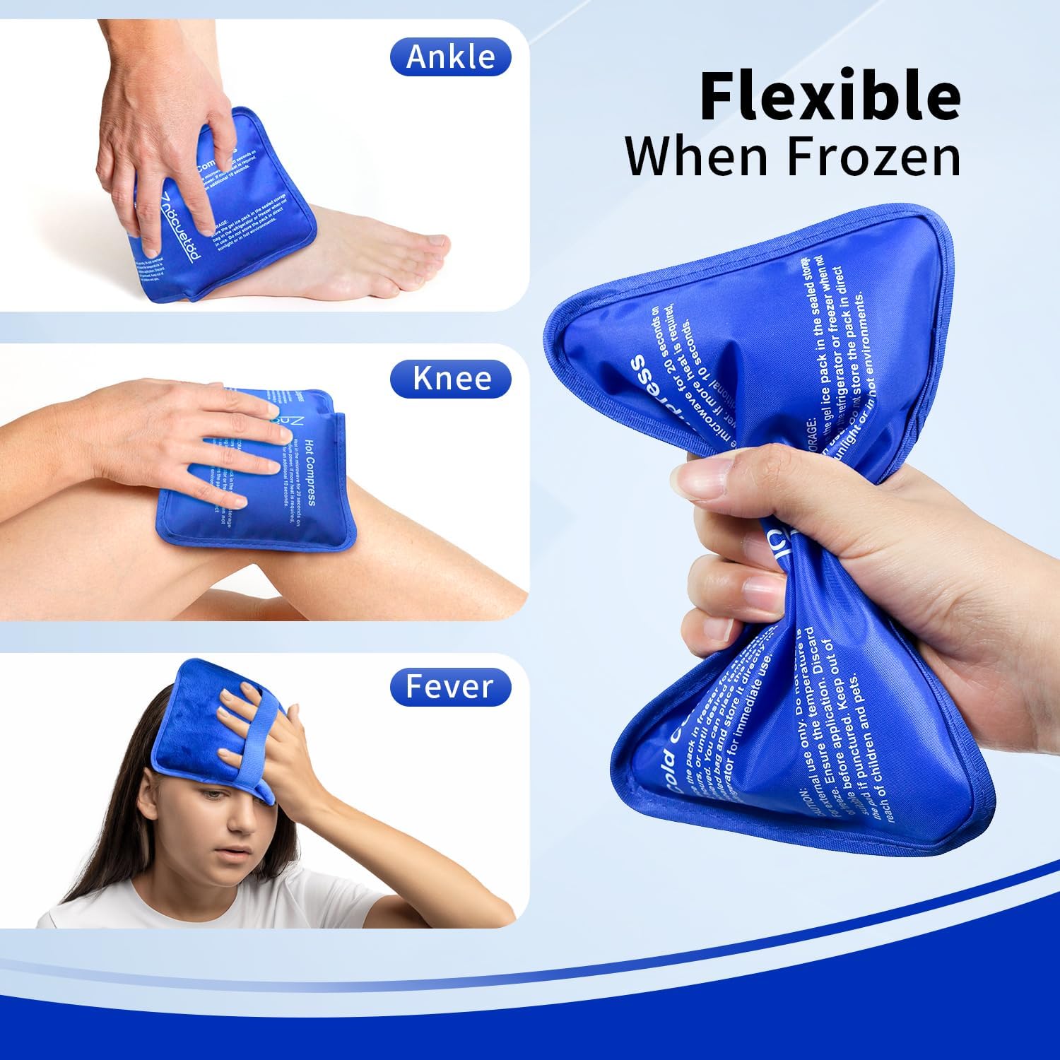 - Multi-functional:Keep pliable after frozen and stay cold for up to 20-30 minutes to achieve full heat or ice therapeutic benefits. Use this soft gel ice pack on your knee, ankle, shoulder, neck, head, face, jaw, elbow, wrist, arm or anywhere else you need.