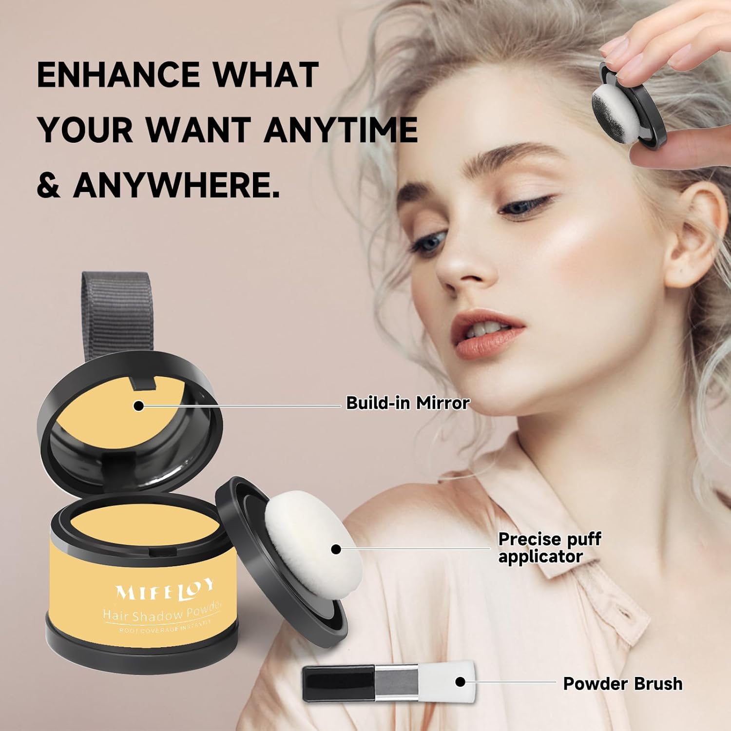 - How to Use - Mifeloy root touch up hair powder is easy to use. It only takes three steps to complete the modification of the hairstyle. The first step is to find the area that needs to be filled. The second step is to Simply remove the base powder puff, dab onto the applicator. The third step is to apply it along the hair texture for a natural and messy effect. For more precision, use your finger to lightly pat the powder.