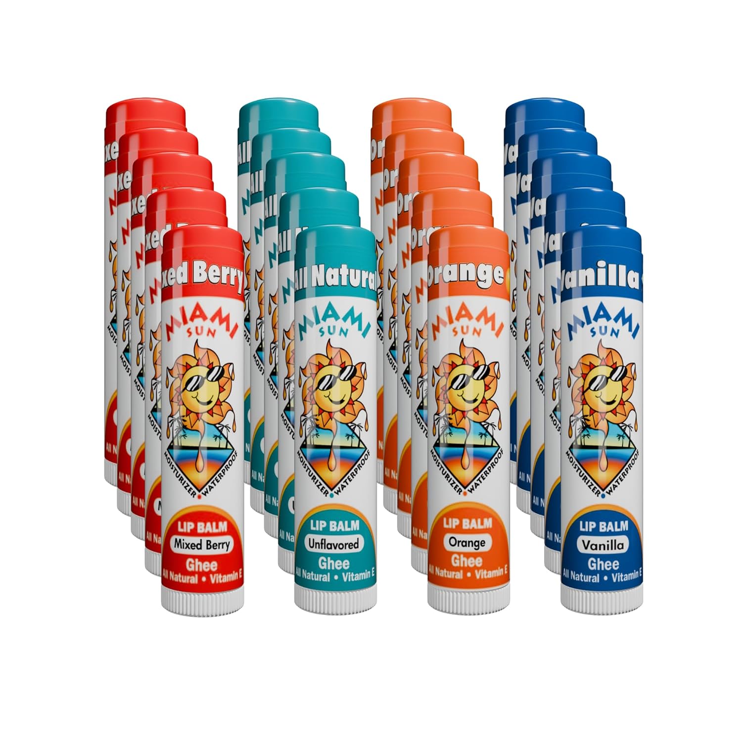 Miami Sun Natural Ghee Lip Balm, Hydrating Lip Treatment with Shea Butter & Beeswax, Organic & Non-Toxic, Best for Dry, Chapped Lips - Moisturizing, Healing, Chemical-Free Lip Care (20 Count, Variety)