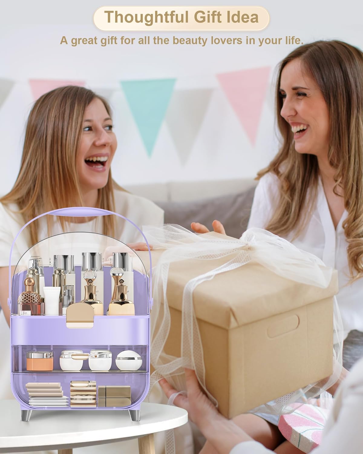 - 🎁【Stylish and Elegant】Beautiful rounded appearance. Adopting professional top design, suitable for any home and women's style. This makeup box is elegant on vanity, bedroom, dresser, countertop, bathroom. Delicate colour is suitable for any room decoration.