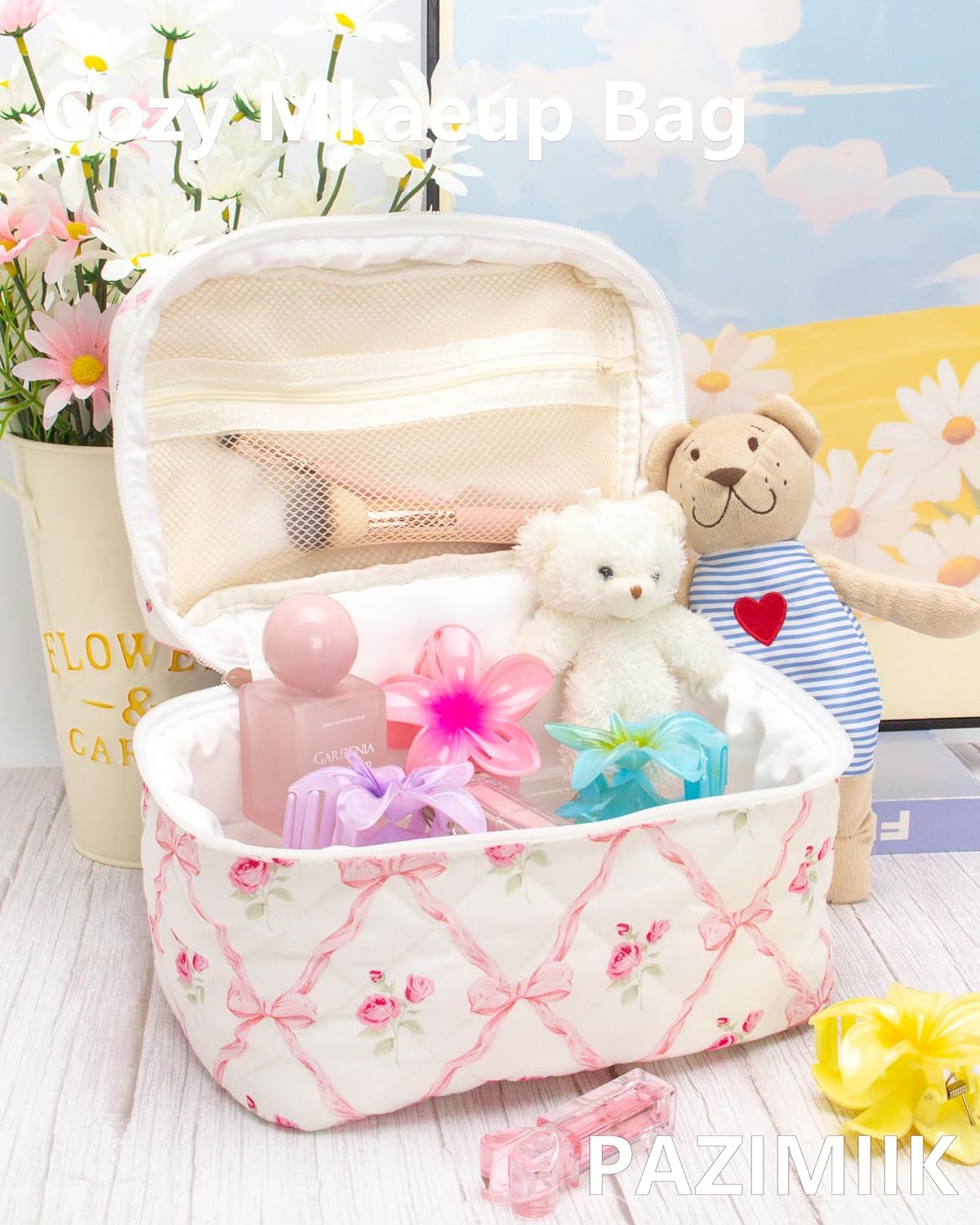 • Softness and Style: The quilted cotton exterior offers a soft and comfortable texture, combining style with functionality for your daily makeup needs.