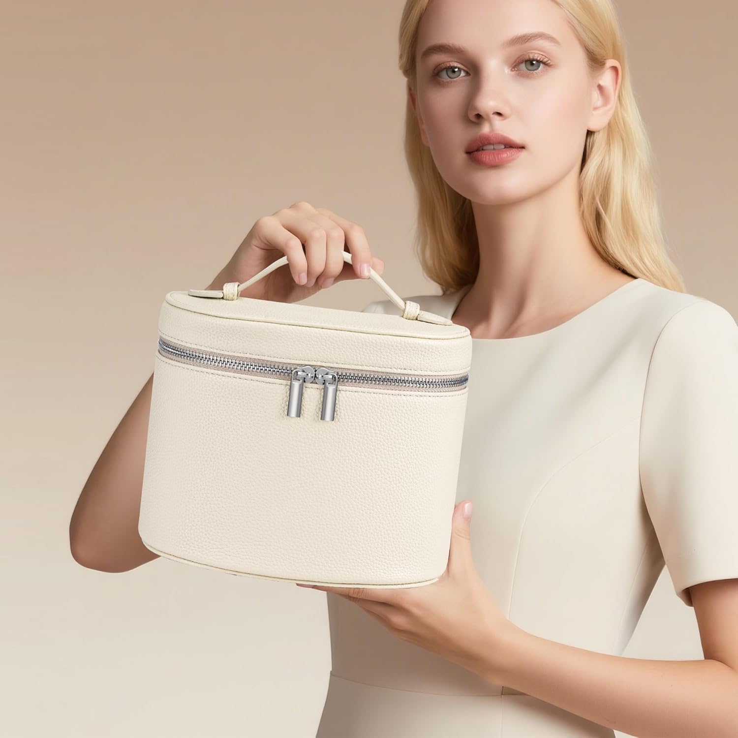 Makeup Bag Vanity Case Cosmetic Bag with Removable Divider Travel Toiletry Bag for Women Portable Make up Box Organizer, Beige