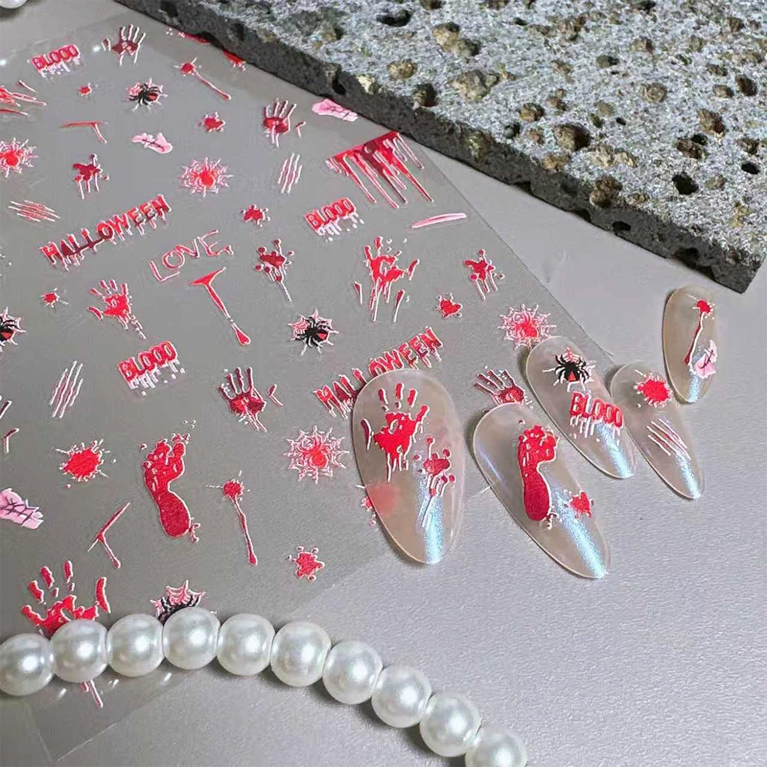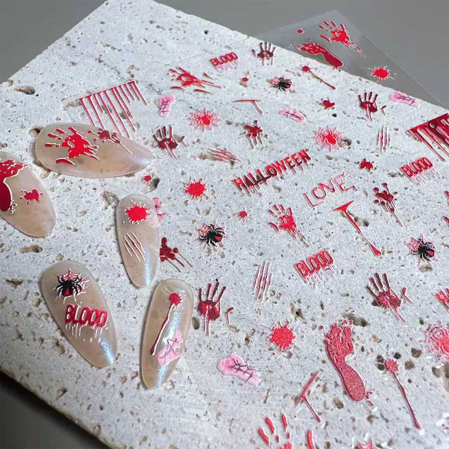 - Self-Adhesive Design: 5D self-adhesive spider nail decals for nail art design is simple and quick to use, bloody handprint nail art decals work great on bare nails, they will stay on for a long time and will not peel off your nails, enjoy the feeling of nail art